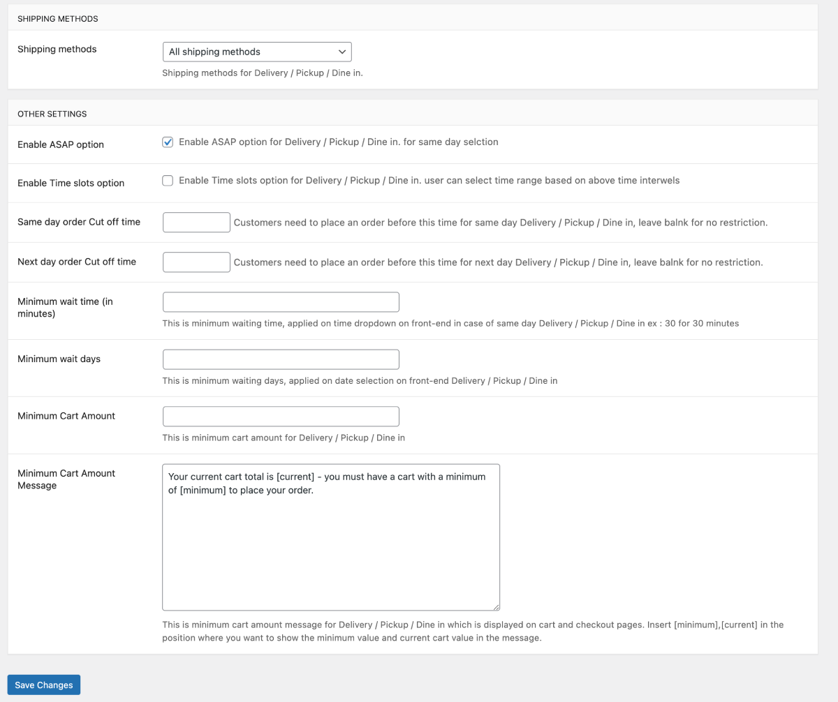 Put the Minimum wait time in minutes. This will will be the minimum waiting time, applied on time dropdown on front-end in case of same day Delivery / Pickup / Dine in ex : 30 for 30 minutes. In the same way you can also put Minimum wait days. This will be the minimum wait days, applied on date selection on frontend of Delivery | Pickup | Dinein